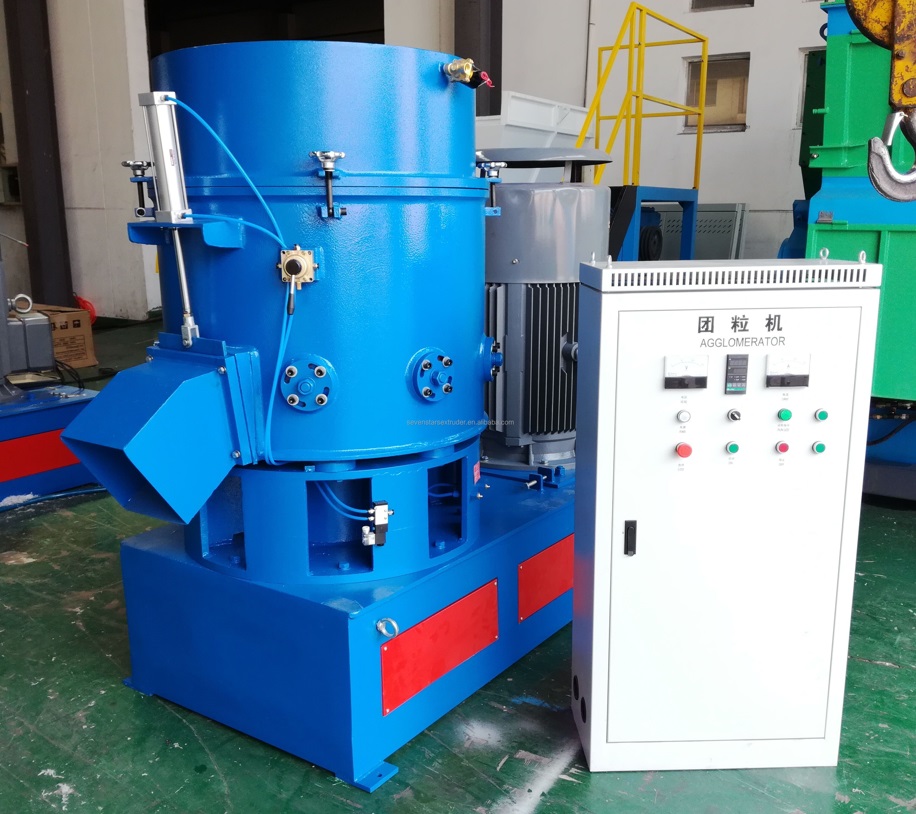 GHX high speed granulator makes disposed plastic films and materials with less than 2mm wall thickness materials into granules. It is suitable for soft PVC, HDPE,LDPE, soft PE, PS, PP and other thermoplastic wastes and films and froth PS wastes. When the waste plastic is supplied into the chamber of such machine, it will be cut into smaller chips due to the crushing function of the rotating knife and fixed knife. During the crushing processing, the material that soaked up lots heat from the frictional movement of material being crushing and the wall of container will be going to become semi-plasticizing state. The particles will stick with each other due to the function of plasticization. Before it sticks each other completely, the cold water pre-prepared is sprayed into the material being crushed. The water will be evaporated off quickly and the surface temperature of material being crushed drop down quickly also. So the material being crushed will become small particles or granules. It is easy to recognize the particles by different size and can be colored by using of color agent being putted into the container during the crushing processing.