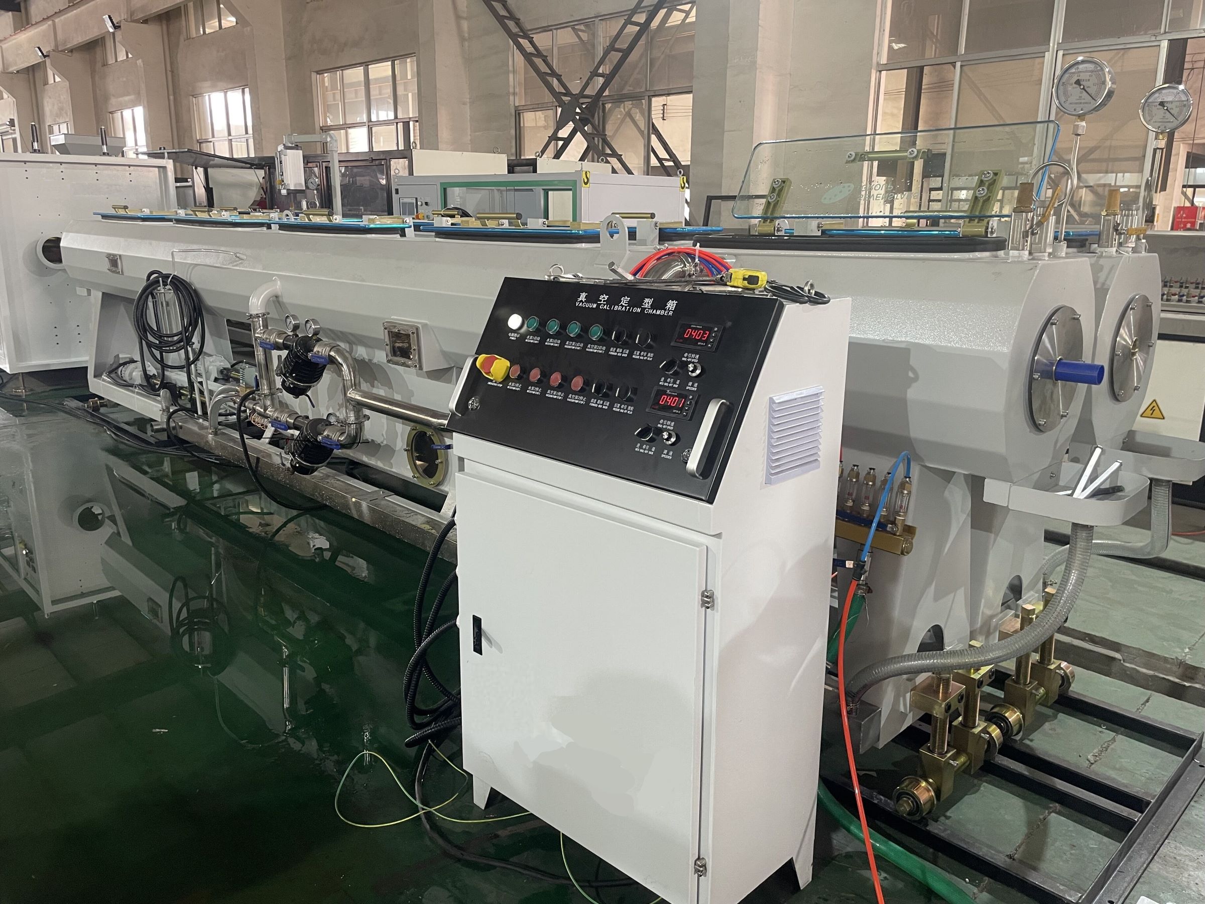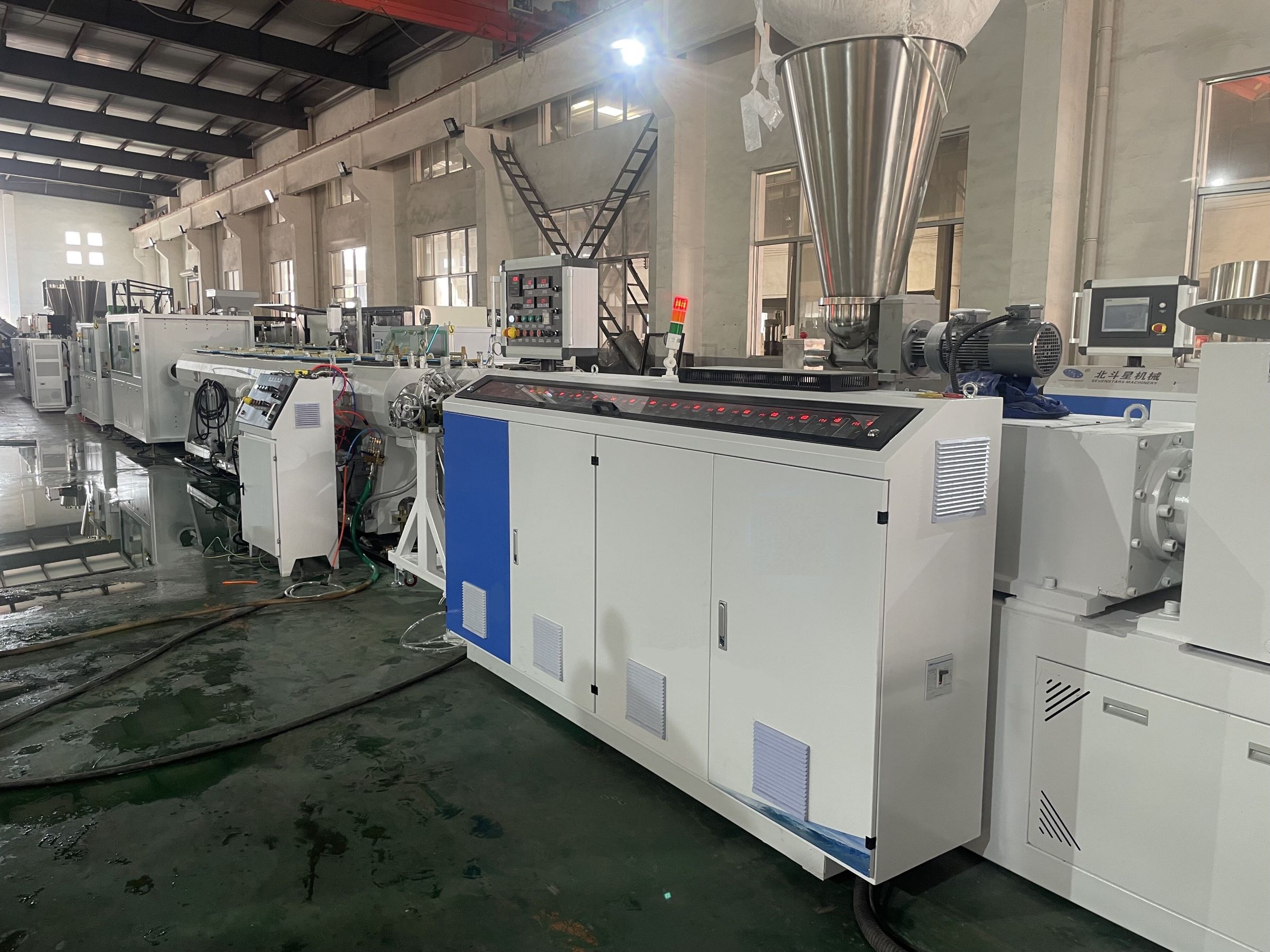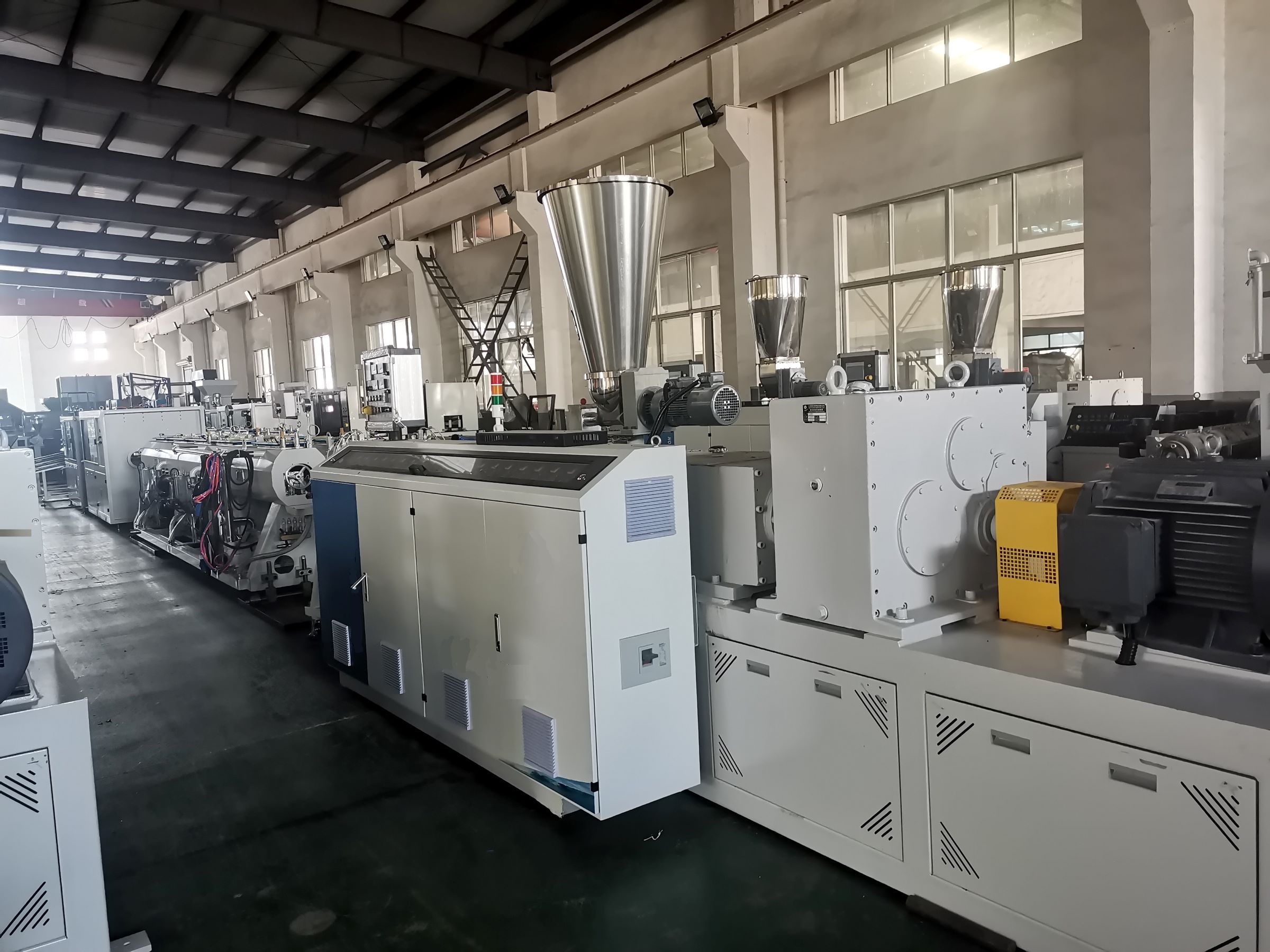 The production line is developed with the advanced technology of west Europe by our company. The main machine is SJSZ55/120 or SJSZ65/132 conical twin screw extruder is equipped with double-tube single control stainless steel spraying calibration,it avoids waste condition when one tube is adjusted and the other one is affected. The auto single-control double drawing machine and cuting machine are combined with the front double calibration technology to make operation more flexible let you enjoy economic benefit which is brought by separate-control double tube extruding.